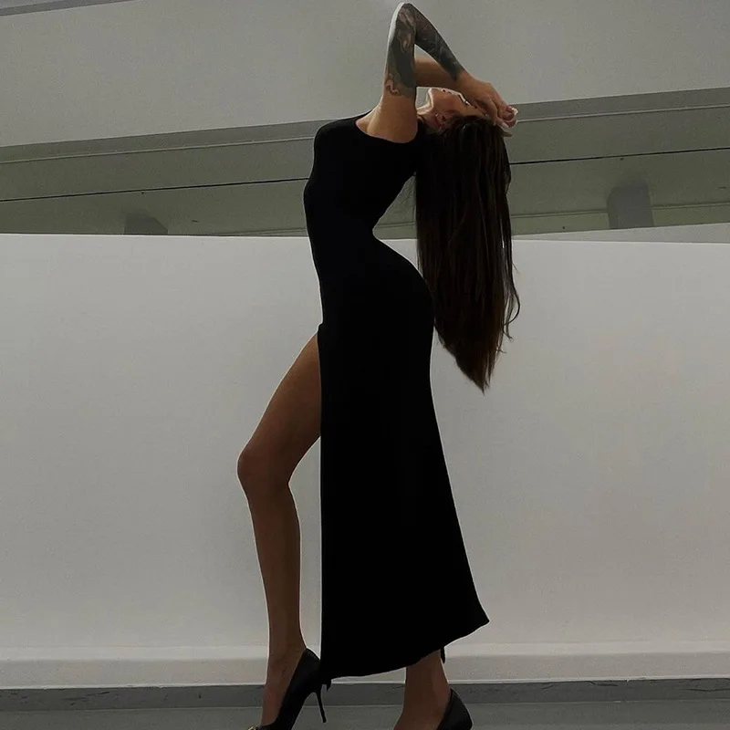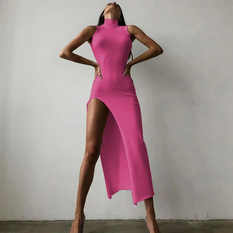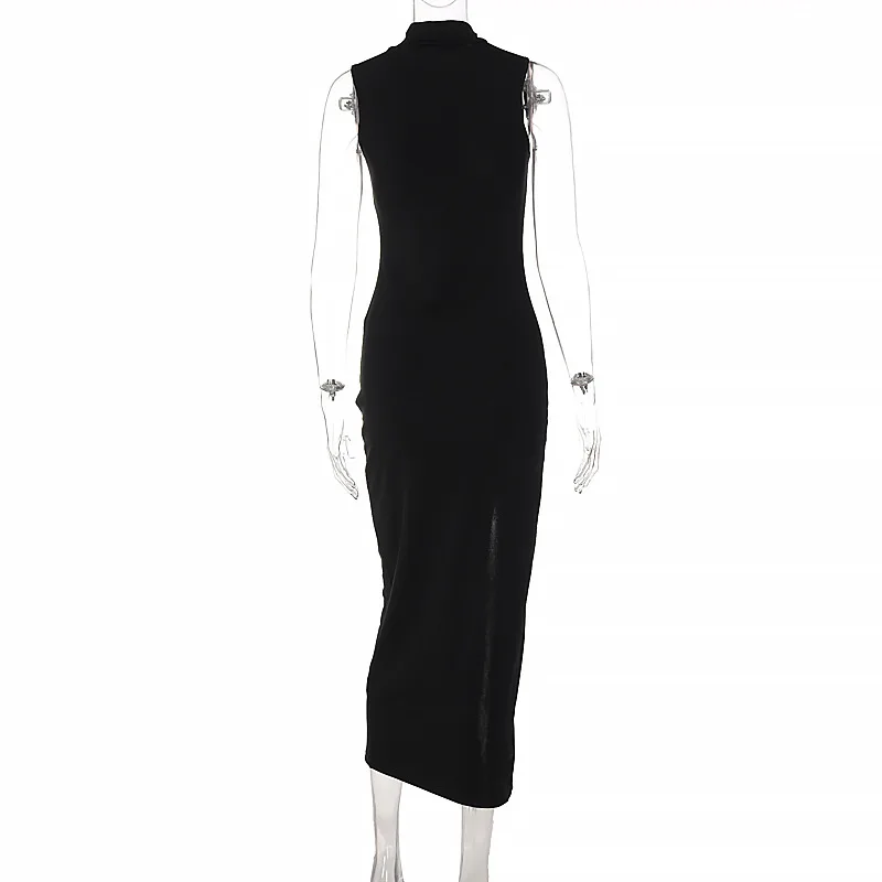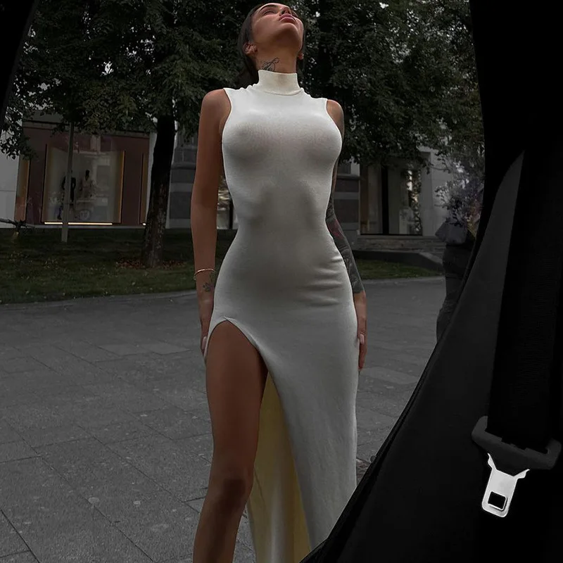تمتّعي بإطلالة جذابة ومترفة مع فستان طويل بدون أكمام بفتحة عالية جانبية، محبوك بعناية ليمنحك مزيجًا مثاليًا من الأناقة والراحة والجاذبية. هذا الفستان صُمم ليبرز القوام بشكل أنيق، مع تفاصيل عصرية تضيف لمسة جريئة ومثيرة تناسب السهرات والمناسبات الخاصة.